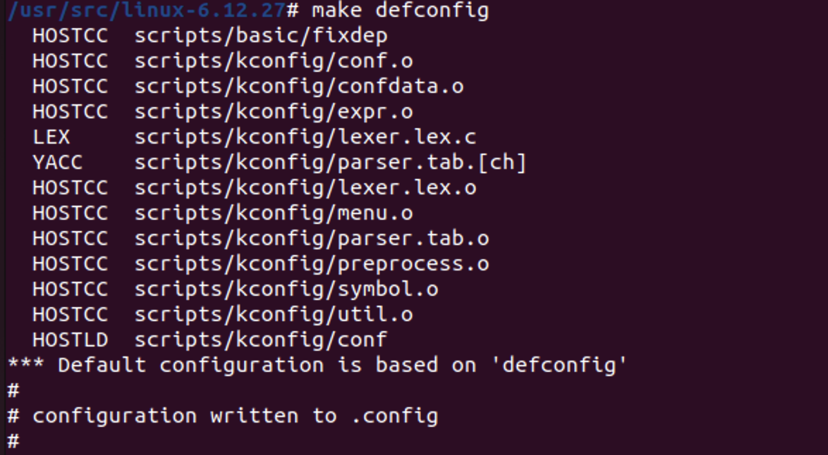 /usr/src/linux-6.12.27$ make O=/home/{user}/build/kernel defconfig